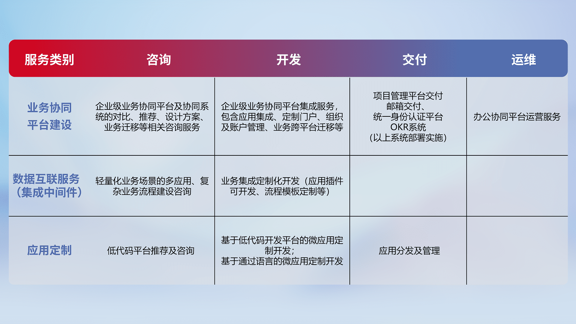 针对钉钉、、、、企微、、、IDaas等平台级产品提供产品的规划、、、、方案、、、交付、、、、定制化开发等服务,,,,实现如统一协同办公、、智能客户服务、、、、混合会议管理、、智能数据查询、、等业务场景,,,实现数字化转型。。