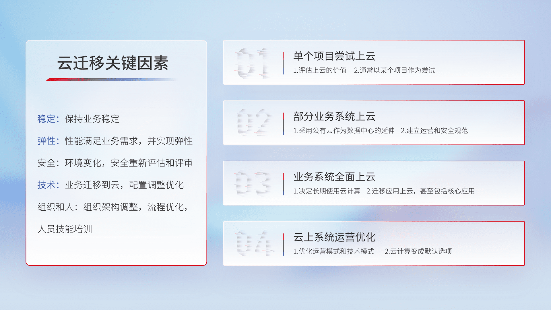 结合实际业务,,,,从规划设计、、、云平台选型、、云原生改造、、、数据迁移、、、、集成交付,,,迁移全过程为客户识别最佳上云路径,,做好风险识别管理,,设计网络架构、、、身份权限、、、安全审计合规、、操作审计、、日志审计、、、监控告警策略、、、多站点容灾设计等,,对云上基础设施进行整体规划,,提升IT治理水平,,,以满足弹性、、、、高可用、、、高性能的需求。。。。