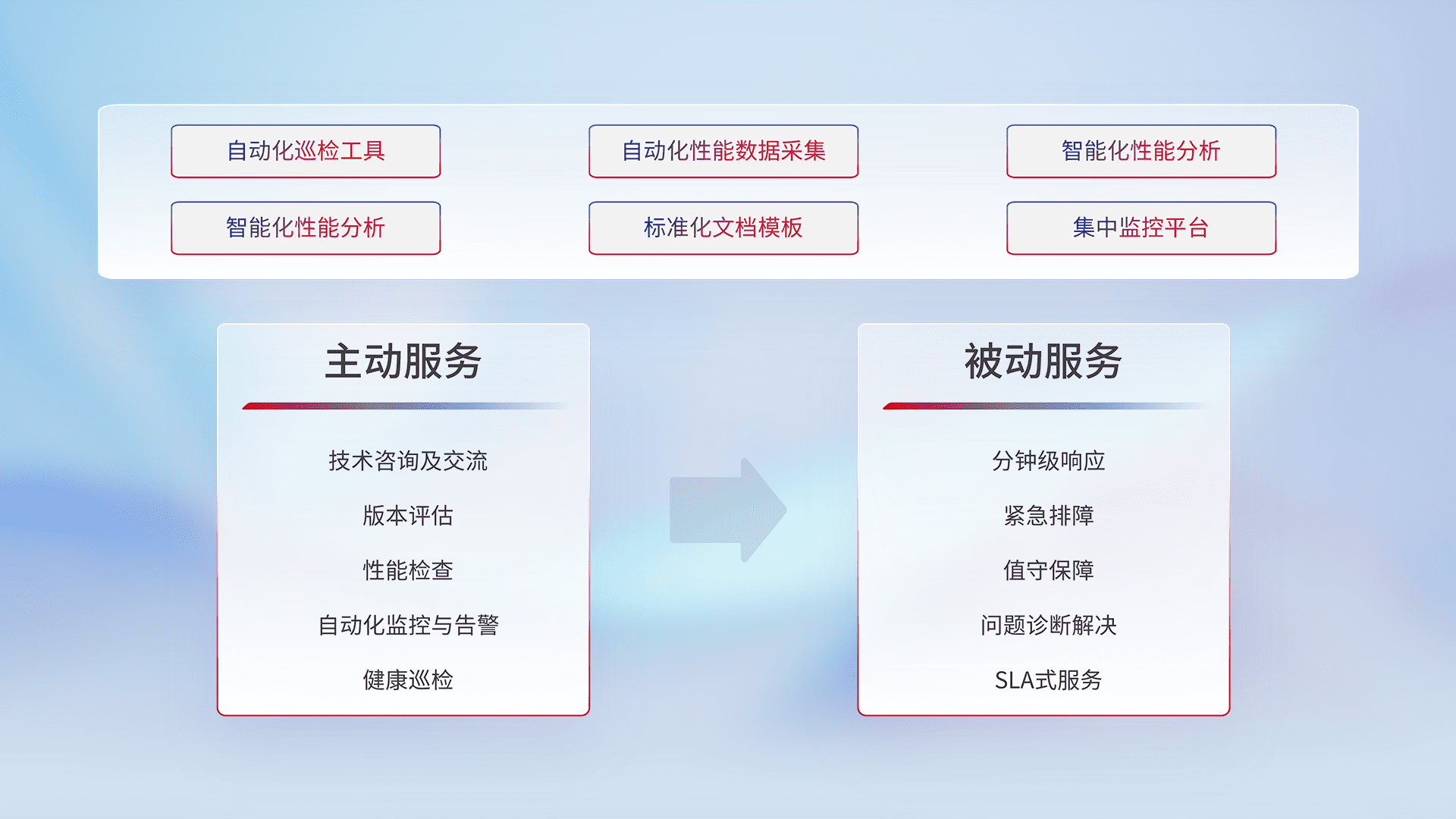 智能化工具和标准化文档,,,,保障服务质量,,提供主动服务(包含技术咨询、、版本评估、、、性能检查、、、、自动化监控与告警、、健康巡检)和被动服务包含(分钟级响应、、紧急排障、、、值守保障、、、问题诊断解决、、SLA服务)。。